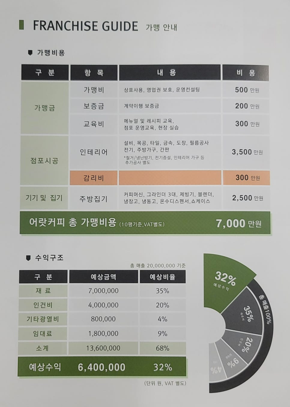 어랏커피의 창업 비용은 약 7000여만원 정도로 알려져 있습니다. 이 비용에는 인테리어, 초기 재고, 장비 구입 등이 포함됩니다. 초기 투자 비용은 지역에 따라 다를 수 있으므로, 정확한 비용은 본사와 상담을 통해 확인하는 것이 좋습니다.